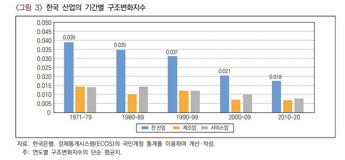 구조변화지수는 산업의 구조변화 속도를 뜻하는 것으로, 산업의 활력 또는 역동성을 보여주는 지표다. 구조변화지수는 이후에도 지속해서 하락해 2017년 기준 0.005까지 낮아졌다.