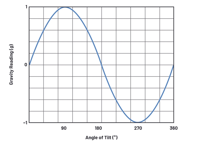 한 축만 가지고 살펴보면, 최대 1g의 판독값을 얻게 될 때는 이 축을 따라 중력이 작용할 때이고, 이 디바이스가 90° 기울어지면 이 판독값은 0g로 감소한다(그림 5).