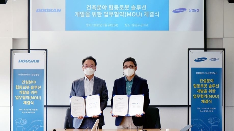 두산로보틱스는 지난달 28일, 분당두산타워에서 삼성물산 건설부문(이하 삼성물산)과 ‘건설분야 협동로봇 솔루션 개발 및 적용’을 위한 업무협약(MOU)을 체결했다고 밝혔다.