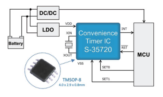 S-35720 시리즈는 EURO 6과 같은 엄격한 자동차 배기가스 규제를 충족하고 EV(전기자동차)의 배터리 안전을 강화하기 위해 고안됐다. 200nA의 초저전력을 소비하는 S-35720 시리즈 편리 타이머를 사용하면, 측정하지 않는 기간 동안 마이크로컨트롤러의 전력을 유지할 필요가 없어 ECU(엔진 컨트롤 유닛)의 대기전력 소모가 현저하게 감소된다.