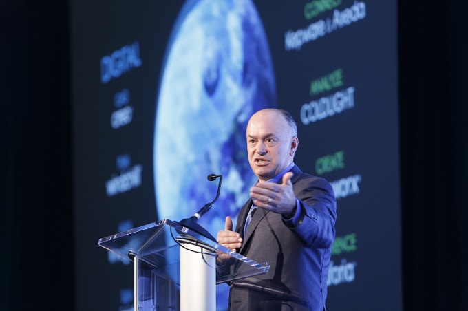 사진. 짐 헤플먼 PTC 최고경영자가 6월 6일부터 9일까지 미국 보스턴에서 개최된 '라이브웍스 2016'에서 기조연설을 하며, 향후 사물인터넷(IoT), 가상현실(VR), 증강현실(AR) 등 새로운 기술이 제품의 DNA와 업계의 판도를 바꾸게 될 것이라고 설명하고 있다. (사진:PTC)