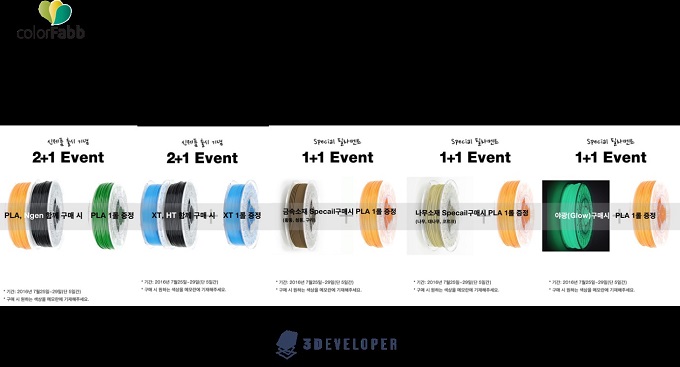 미래교역의 신사업 브랜드인 3Developer는 3D프린터 원료 및 소재 개발 전문업체인 Colorfabb(칼라팹)의 아시아 총판 계약 확장 기념 이벤트를 진행한다.