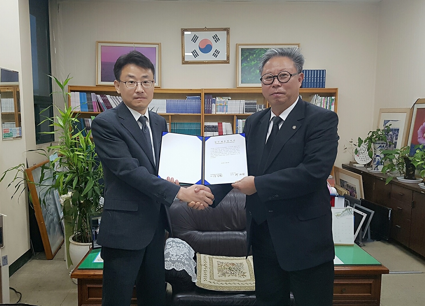 ▲ ㈜펄의 구자상 대표(왼쪽)와 전국문화원사무국장연합회 강임원 회장(오른쪽)이 제휴를 체결하고 기념 촬영하고 있다.