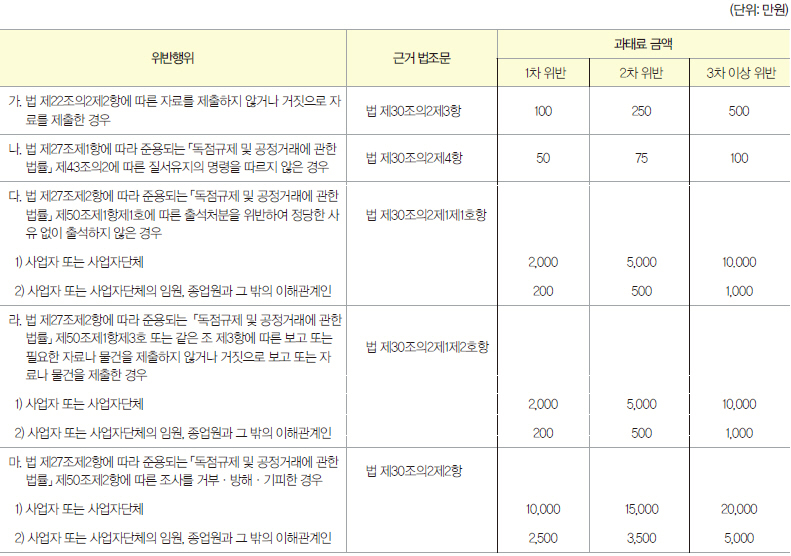 한편, ▶‘공정위 출석 요구에 대한 미출석’ ▶‘조사 거부·방해·기피’ ▶‘심판정 질서 유지 의무 위반’ 등 3개 행위의 경우, 하도급법상 과태료 부과 대상 행위로 규정되어 있으면서도 이전 시행령에 그 구체적인 기준이 설정되어 있지 않고 있었는데, 이번 개정 시행령에 이들 3개 행위에 대해서도 자료 미제출처럼 ‘최근 3년 동안 과태료 부과 처분을 받은 횟수’를 고려하여 과태료가 부과되도록 규정했다.