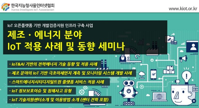 이번 세미나에서는 IoT&AI 기반의 전력에너지 기술 동향 및 적용사례, 제조 분야의 IoT 기반 극초미세먼지 계측 및 모니터링 시스템 개발 사례, 스마트에너지시티 디지털트윈 플랫폼 서비스 적용사례, IoT 정보보호 이슈 및 침해사고 유형, IoT 기술지원센터 및 이용방법 소개 등이 발표될 예정이다.