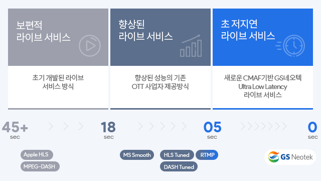 GS네오텍이 발표한 ‘초저지연 라이브 서비스’는 CMAF(Common Media Application Format) 기술을 기반으로, 기존 라이브 서비스 송출 간에 발생했던 지연시간을 약 10초에서 1~2초 수준으로 최소화 해 시청자가 괴리감 없이 현장 상황을 경험하도록 지연시간을 대폭 감소시킨 서비스다.