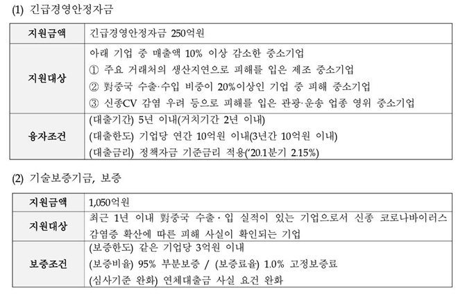 ▲중소벤처기업부 '자금·보증 등 경영안정자금 지원 : 긴급경영안정자금 250억 원(중소기업진흥공단), 보증 1050억 원(기술보증기금)