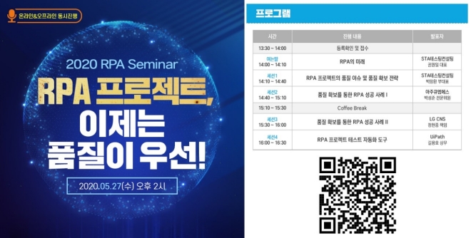 4개의 발표 세션은 RPA의 품질확보 전략(STA테스팅컨설팅), 품질확보를 통한 성공적인 RPA 도입 사례 I(아주큐엠에스), 품질확보를 통한 성공적인 RPA 도입 사례 II(LG CNS), RPA 프로젝트에서 테스트 자동화 도구를 활용해 품질확보를 하는 방법(유아이패스코리아)로 구성될 예정이다.