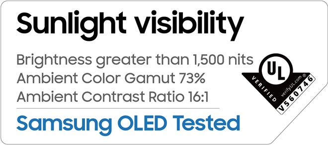 UL은 평가를 위해 디스플레이의 야외 시인성에 영향을 주는 색영역과 휘도 등을 측정했다. 그 결과 삼성 OLED는 '밝은 환경에서의 색영역(Ambient Color Gamut)'이 DCI-P3 기준 73%를 충족했으며 최고 휘도는 1,500nit 이상으로 나타났다.