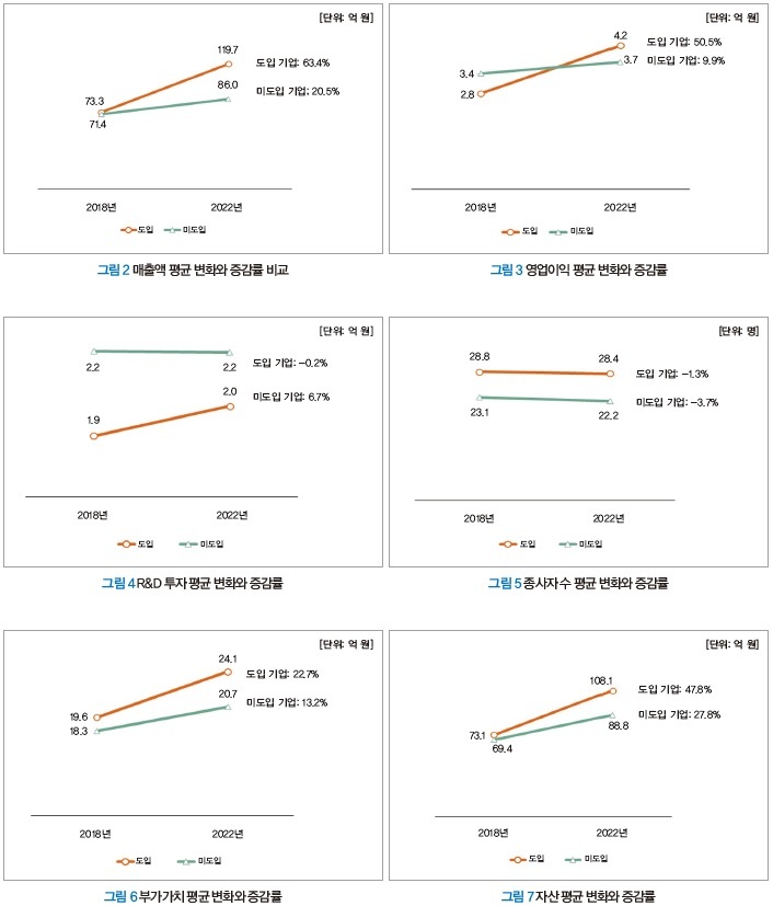매출액의 경우, 스마트공장 도입기업은 도입 전(2018년) 73.3억 원에서 도입 후(2022년) 119.7억 원으로 63.4% 증가한 반면, 미도입 기업은 같은 기간 동안 71.4억 원에서 86.0억 원으로 20.5% 증가한 데 그쳤다.