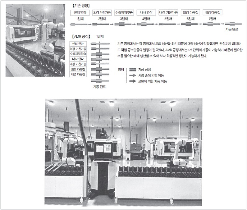 이 각 공정 간을 사람의 손으로 이동하지 않고 2대의 AMR이 자율주행해 공급·배출함으로써 리드타임 단축과 고효율의 생산 라인을 실현했다. 기존에는 각 공정에서 로트 생산을 하기 때문에 대량 생산에는 적합했지만, 완성까지 최저라도 작업 공수만큼의 일정이 필요했다. AMR을 사용함으로써 1개 단위의 가공이 가능하게 됐기 때문에 필요한 때에 필요한 수량을 생산할 수 있게 되어 보다 효율적인 생산이 가능해졌다(그림 3).