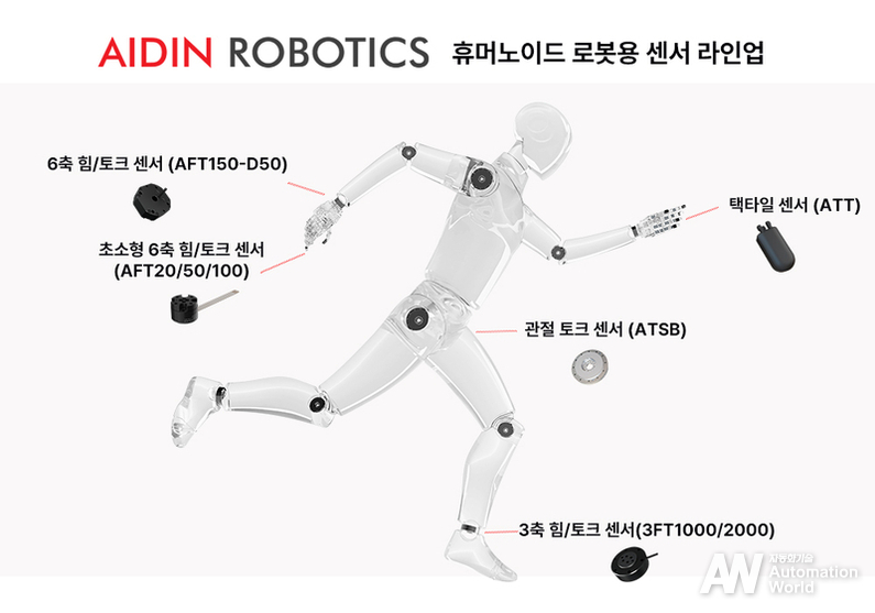 이번에 공개되는 에이딘로보틱스 휴머노이드 로봇용 센서 신제품 3종은 사람과 유사한 감각 기능을 부여하는 솔루션이다. 구체적으로, ▲손 끝에 장착돼 접촉 위치와 힘의 분포를 감지하는 ‘택타일 센서(ATT)’ ▲발목에 적용되는 보행, 균형 제어 전용 ‘3축 힘·토크 센서(3FT1000·3FT2000)’ ▲손목·관절 등 좁은 공간에 최적화된 ‘6축 힘·토크 센서(AFT150-D50)’ 등이 현장에서 펼쳐진다.