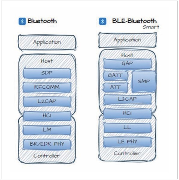 블루투스 클래식과 BLE(일명 Bluetooth SMART)는 동일하게 컨트롤러(Controller), 호스트(Host), 애플리케이션(Application)의 세 가지 기본 구성 블록을 기반으로 하지만, 각각 고유한 프로토콜 스택을 가지고 있다. BLE 스택의 계층은 하단부터 다음과 같이 구성된다.