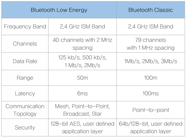 BLE 기술은 짧은 데이터 전송 버스트(short burst)를 사용하는 반면, 블루투스 클래식은 지속적인 데이터 스트리밍(continuous data streaming)을 사용한다. 따라서 블루투스 클래식은 오디오 스트리밍이나 파일 전송 등 지속적 데이터 전송에 적합하지만, BLE는 주기적으로 절전 상태(sleep mode)에 있다가 연결이 필요할 때만 활성화되어 데이터를 전송하므로 전통적인 블루투스 대비 약 1/10 수준의 에너지 소비로 구동된다. 표 1에서는 BLE와 블루투스 클래식의 기술 사양을 비교하고 있다.