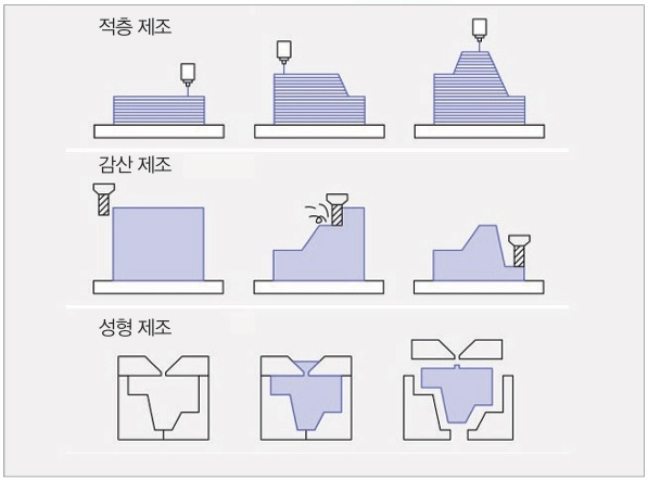 이러한 고질적인 난제에 대한 로드맵을 제시하는 솔루션 중 하나가 적층 제조(Additive Manufacturing) 기술이다. 3D 프린팅으로도 인식되는 이 기술은 대량 생산과 비용 경쟁력을 확보하기 위한 기존 제조 방법론과는 궤를 달리한다. 원소재를 깎아내 필연적으로 폐기물을 다량 발생시키는 감산 제조(Subtractive Manufacturing)나, 막대한 초기 비용과 긴 리드 타임을 요구하는 성형 제조(Forming/Molding) 등과 다른 길을 택한다.