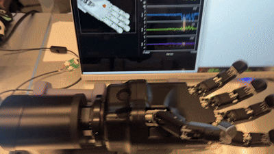 ▲ 'Humanoids 2025' 및 'CoRL 2025’ 현장에 배치된 에이딘로보틱스 센싱 기술. 로봇 손가락에 탑재된 택타일 센서 'ATT'(좌)와 로봇 손바닥·손목에 6축 힘·토크 센서 ‘AFT150’(우)를 기자가 참관하고 있다. (촬영·편집 : 헬로티 최재규 기자)