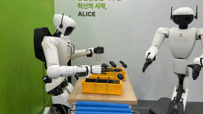 ▲ 앨리스 4(좌)와 앨리스 M1(우)이 협동 작업을 수행하고 있다. 이 모습은 지난해 '대구국제로봇산업박람회 2025' 현장에 방문한 이재명 대통령도 참관한 바 있다. (촬영·편집 : 헬최재규 기자)