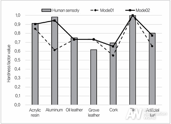 Mode01은 누르는 압력 일정 프로그램, Mode02는 기계학습 시스템을 탑재한 시스템에 의한 실험 결과로 한다. 3회의 계측 평균값을 ‘각 인자’ 측정값으로 하여 꺾은선 그래프로, 심리 평가값을 막대그래프로 하여 경도 인자의 실험 결과를 그림 3에 나타냈다. Mode01에서는 아크릴, 글러브 가죽, 코르크, 인공 잔디 등에서 심리 평가값과 괴리가 보였다. Mode02에서는 글러브 가죽에서는 괴리가 보였으나, 다른 소재에서는 개선되어 심리 평가값과 가까운 값을 나타내고 있다. 소재에 대한 적절한 누르는 압력을 학습함으로써 인식이 어려운 소재의 인식이 가능해졌다.