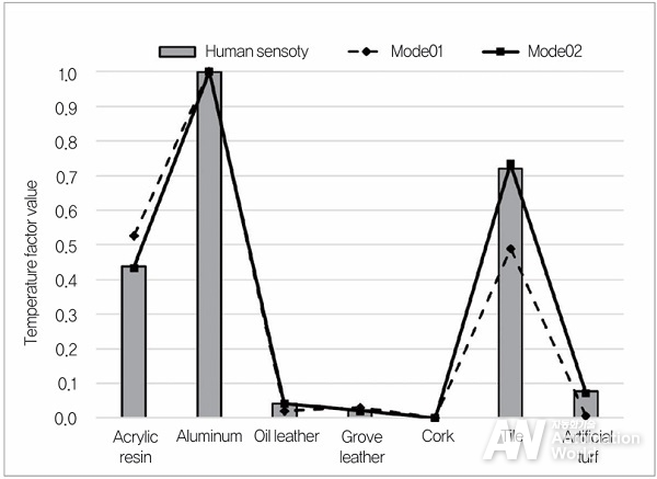 경도 인자는 물건이 단단하다고 느낄수록 수치를 높게 한다. 기준 시료는 가장 부드럽다고 느끼는 것으로 인공 잔디를 이용했다. 표면 상태 인자는 시료 표면의 요철이 심할수록 값이 높아진다. 기준 시료는 가장 표면 거칠기가 작은 타일을 선정했다. 온도 인자는 시료에 접촉했을 때에 차갑다고 느낄수록 값을 높게 하기 위해 전열성이 낮은 인공 잔디를 기준 시료로 했다. 심리 평정 결과로부터 ‘경도 인자’, ‘표면 상태 인자’, ‘온도 인자’의 세 가지 인자에 대해 개인차는 있으나, 그 경향은 대체로 일치했다. ‘경도 인자’에서는 피험자가 단단한 시료로 타일, 부드러운 시료로 인공 잔디를 인식하고 있다는 것을 알 수 있다. 그러나 가죽 소재나 코르크 등 특징이 적은 시료의 경우는 피험자에 따라 인식의 폭이 넓었다. ‘표면 상태 인자’에서는 피험자가 거친 시료로 인공 잔디, 매끄러운 시료로 타일을 인식했다. 기타 시료에서는 피험자에 따라 큰 차이는 보이지 않았다. ‘온도 인자’에서는 피험자가 온도 차가 큰 시료로 알루미늄, 작은 시료로 인공 잔디를 인식했다.