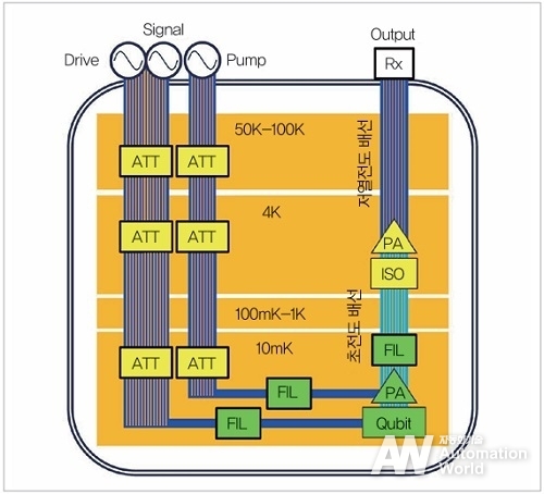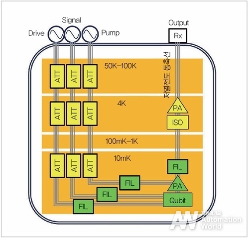 양자 컴퓨터는 앞에서 언급한 바와 같이 저온 환경에서 미약한 포톤 신호를 검출해야 하기 때문에 다양한 마이크로파 회로를 이용해 신호 검출을 하고 있다. 양자 컴퓨터 동작에 기반한 신호 구성 개략도를 그림 1에 나타냈다. 양자 컴퓨터의 심장부인 Qubit은 10mK 스테이지에 배치되며, 실온 환경에 있는 두 개의 신호원으로부터 제어용 Drive 신호와 읽기용 Signal 신호를 입력받아 동작한다. 도중에 들어가 있는 감쇠기(ATT)는 실온의 열 잡음을 저감하기 위한 것으로, 각 온도 스테이지의 열 잡음량에 맞춰 감쇠시키기 위해 분산 배치되어 있다. Qubit에서 나온 출력을 Signal 신호의 2배 주파수인 Pump 신호와 함께 넣은 진행파 파라메트릭 증폭기(TWPA)로 증폭하고, 대역 외의 신호를 감쇠시키는 필터, 이어서 반도체 증폭기의 신호 반사를 저감하는 ATT, 화합물 반도체 소자인 HEMT 등을 이용한 반도체 증폭기를 통과한 신호를 실온의 측정장치에서 수신하여 신호 처리를 한다.