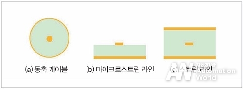 먼저 고주파 신호를 통과시키기 위한 일반적인 배선 기술을 그림 4에 나타냈다. 가장 잘 알려진 기술은 (a) 동축 케이블이다. 중심의 도체와 이를 둘러싸도록 유전체와 그라운드 도체가 배치되어 있다. 일반적으로는 구리로 둘러싸인 세미리지드(semi-rigid) 타입이 특성의 안정성 때문에 많이 이용되지만, 그라운드 측의 도체에 구리 테이프나 구리 망선을 이용하는 플렉시블 타입도 자주 사용된다. 다음의 (b) 마이크로스트립 라인은 동축 케이블을 펼친 형태로 상부의 신호 도체와 하부의 그라운드 도체가 유전체 기판의 양쪽에 배치된다. 기판을 이용한 배선으로 자주 사용되는 배선 기술이며, 유전체 기판의 두께로 배선 폭을 조정하는 것이 가능하다. 마지막으로 (c) 스트립 라인은 마이크로스트립 라인의 상부로 누출되는 전자계를 효율적으로 가두기 위해 상하에 그라운드 도체를 배치시킨 배선이다. 다층 기판의 내부 배선으로 일반적으로 이용된다. 이러한 배선 기술은 그림 4를 보면 잘 알 수 있듯이 그라운드 도체의 단면적이 크게 되어 있으며, 열전도의 큰 요인이 된다.
