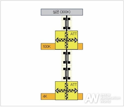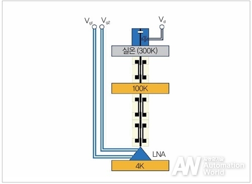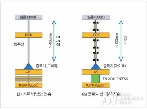 양자 컴퓨터의 입출력을 구성하는 동축 케이블을 플렉시블 기판을 이용한 고밀도 배선으로 대체한 경우의 구성 예를 그림 2에 나타냈다. Qubit에서 나온 출력을 거의 감쇠 없이 반도체 증폭기에 접속하기 위한 초전도 배선을 이용해 각 고주파 부품을 접속하고, 다른 부품 간은 플렉시블 기판을 이용한 고밀도의 저열전도 배선을 이용해 접속한다. 기존의 저열전도 특성을 가진 동축 케이블은 통과 손실이 크기 때문에 4K 스테이지에 배치된 반도체 증폭기의 이득 특성은 동축 케이블의 손실과 열 잡음의 벽을 넘는 특성이 필요해진다. 따라서 반도체 증폭기의 이득을 크게 확보하기 위해 3단 증폭 소자를 이용한 증폭기가 일반적으로 이용되고 있다.